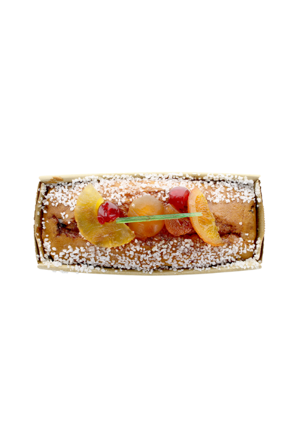 - Ingredients Ingrédient : Farine de FROMENT, sucre, OEUFS entier, BEURRE, Fruits (26%) (Papaye, écorce d’orange, bigarreaux, orange, melon, ananas, abricot ; saccharose ; sirop de glucose-fructose ; conservateur E202, E220 (sulfite) ; correcteur d’acidité : E330, colorants : E120, E150a, E133), poudre à lever : E450, E500, E341 ; amidon modifié, émulsifiants E475, E471 ; amidon de FROMENT, sel, poudre de LAIT écrémé, concentré de carthame, colorants : E160a ; agent de traitement de la farine : E300, xylanase, aplha-amylase, carboxyl proteinase.