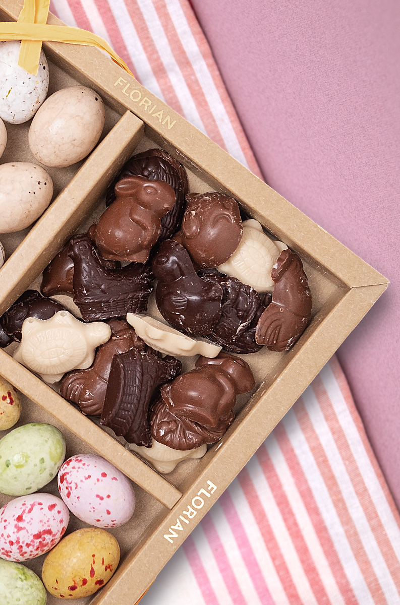 Le retour du printemps annonce le renouveau de la nature et le plaisir retrouvé des traditions gourmandes. Pour cette saison, notre maison a imaginé une création qui rend hommage à la simplicité et à la richesse de notre terroir : le coffret de chocolats de Pâques nommé coffret de la ferme. Conçu comme un écrin de naturalité, ce coffret en carton brut recyclé évoque les racines de notre savoir-faire artisanal et la noblesse des matières premières que nous travaillons chaque jour dans nos ateliers à l’ancienne.
